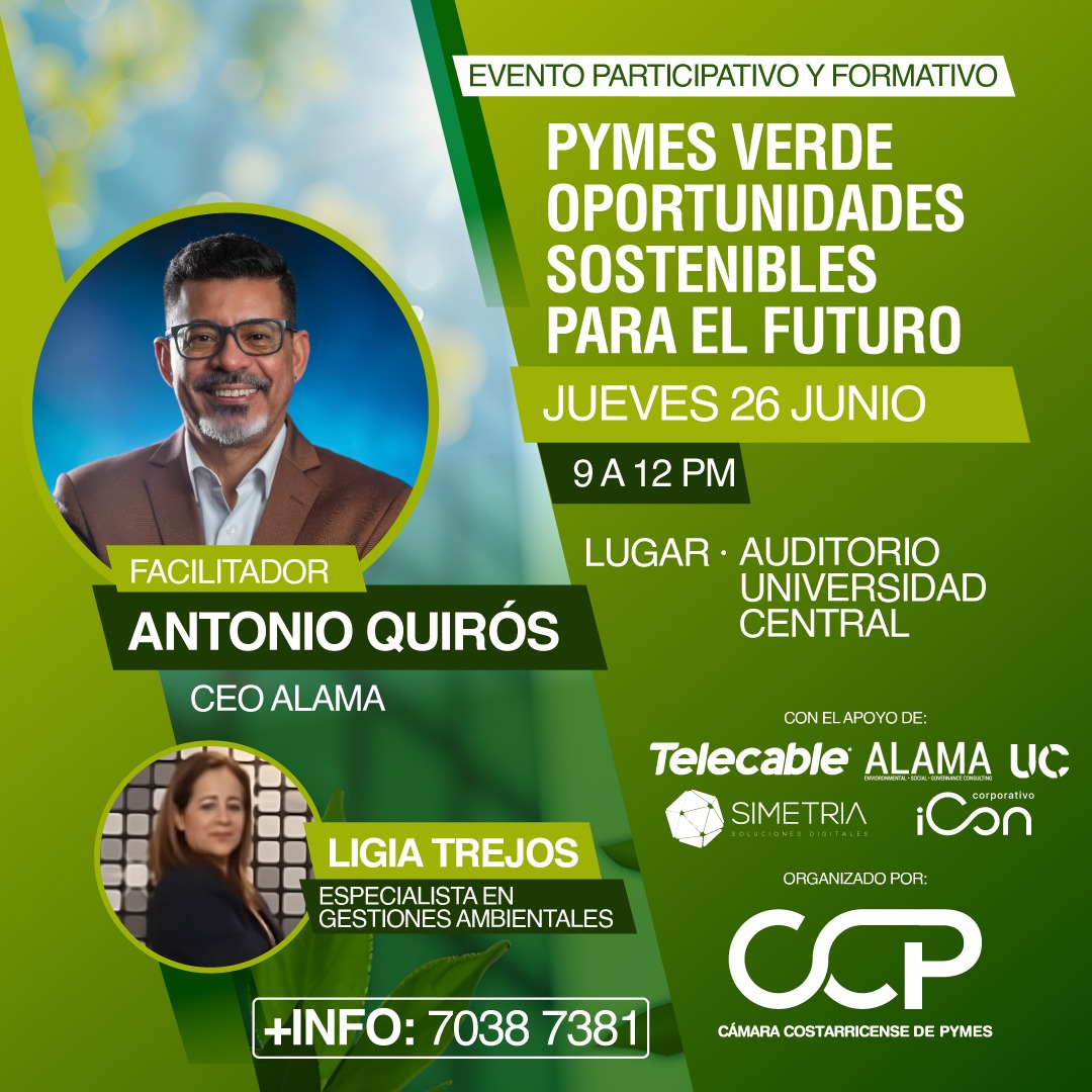 ¿Querés que tu pyme sea parte de la transformación sostenible? Este 26 de junio te esperamos en un evento formativo y participativo enfocado en las oportunidades verdes que están cambiando el rumbo de los negocios. Hora: 9:00 a.m. a 12:00 m.d. Lugar: Auditorio Universidad Central Facilitador: Antonio Quirós – CEO de ALAMA Invitada especial: Ligia […]